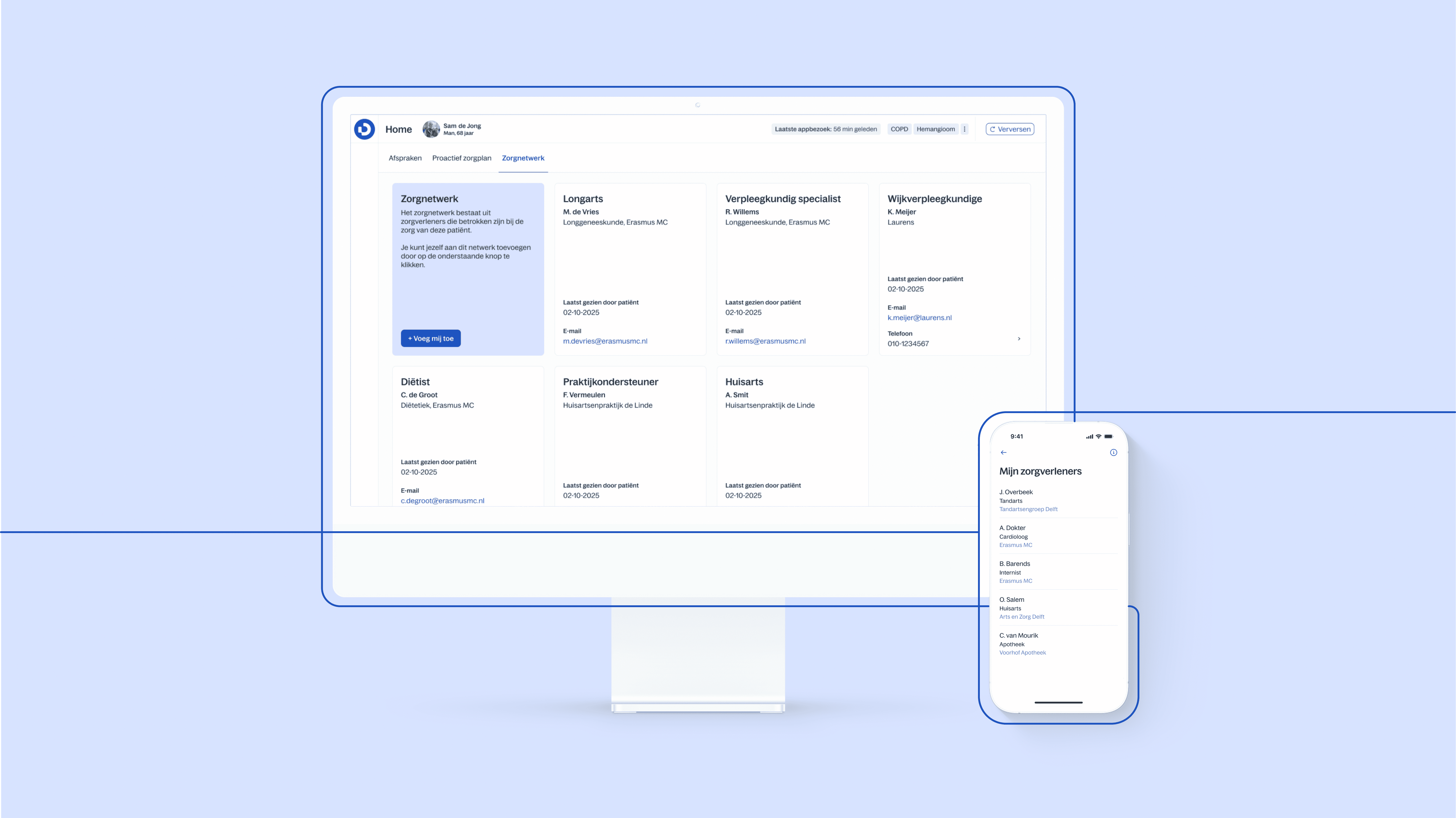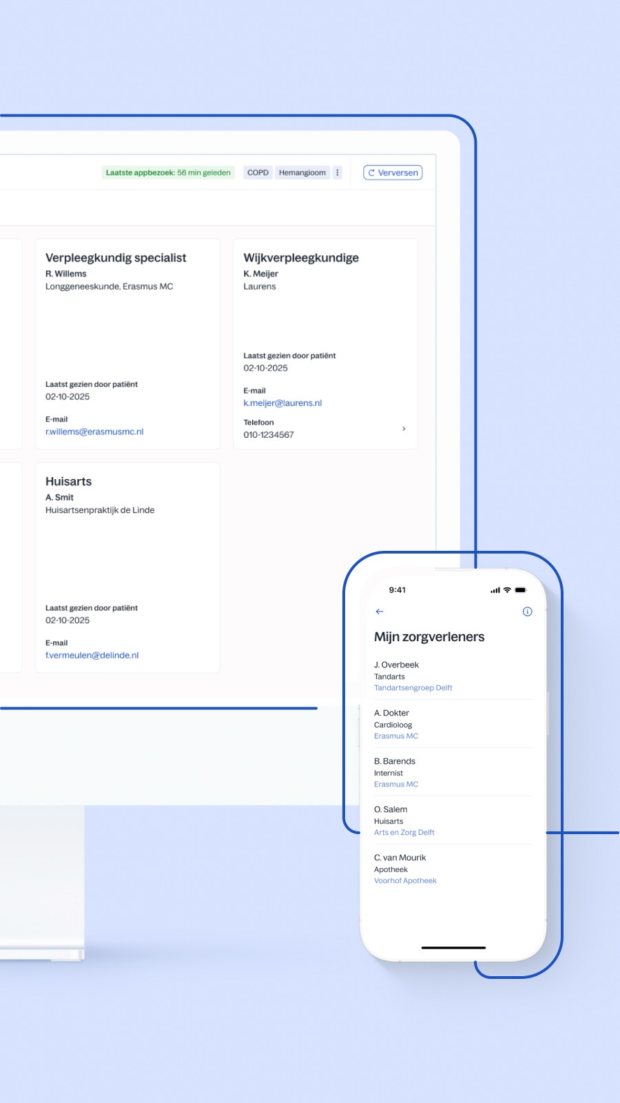 Tegelijk is informatie vaak versnipperd. Tussen huisarts, ziekenhuis, (wijk)verpleging en andere betrokkenen. Cliënten moeten hun verhaal opnieuw vertellen. In zorg name kost tijd en overdrachten komen vaak laat. En ook voor naasten is het lastig om verbonden te blijven en goed geïnformeerd te zijn.